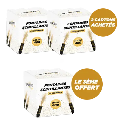 Ce lot de 1440 fontaines scintillantes est en réalité une offre spéciale : achetez deux boites de 480 cierges magiques puis obtenez une boîte gracieusement offerte. Avec autant de feux de Bengale à votre disposition, vous être certain de ne pas rater une seule occasion d'éblouir vos invités ou amis.