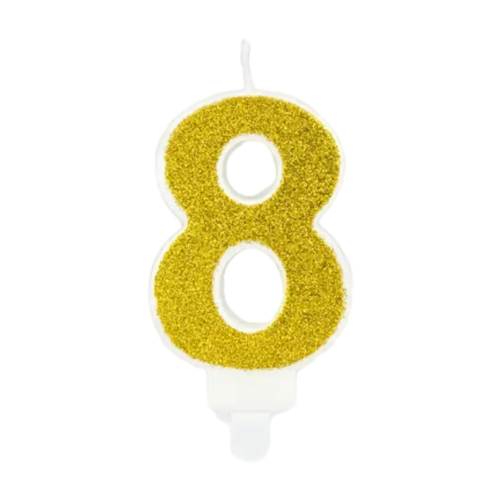 Notre bougie en forme de 8 est le complément parfait si vous désirez un gâteau d'anniversaire qui scintille. Elle se présente sous la forme de la lettre 8 et est recouverte de fines paillettes d'or, un véritable objet brillant qui illumine votre gâteau.