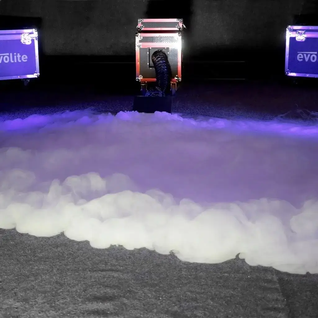 Cette machine à fumée lourde Evolite Heavy Fog 2000 ne nécessite pas de glace lors de son utilisation. Comme nous l'avons vu, il vous suffit d'ajouter de l'eau et du liquide spécial fumée lourde dans le réservoir de la machine. Après un temps de chauffe de 3 minutes, une fumée épaisse se déversera au sol avec un débit de 50 à 60 m3 par minute.