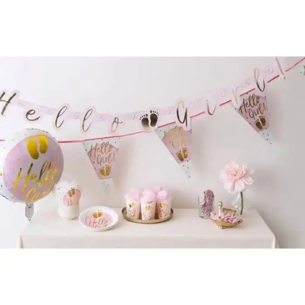 Un baby shower nécessite la création d'un cadre qui plonge les participants dans l'univers de la petite enfance. Les serviettes en papier "Hello Girl" de couleur rose vous serviront à répondre à ce principe si l'événement concerne une fille. Sur chaque serviette de forme carré (21 x 21 cm), l'inscription "Hello Girl" en couleur or et les dessins de deux petits pas situent les convives dans le contexte de la fête.