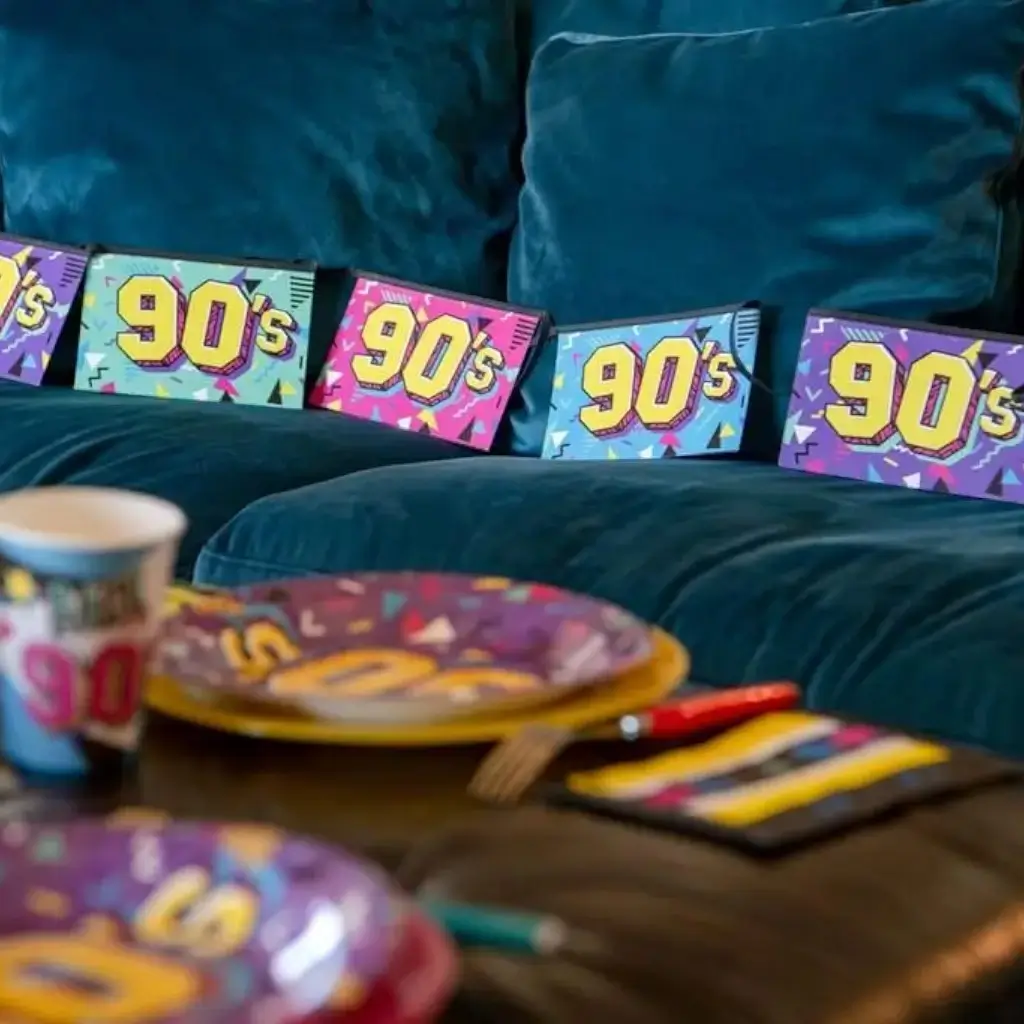 La Banderole 90's est un excellent moyen de décorer une fête à thème 90's de manière simple et efficace. Elle est fabriquée en carton, ce qui la rend durable et abordable.